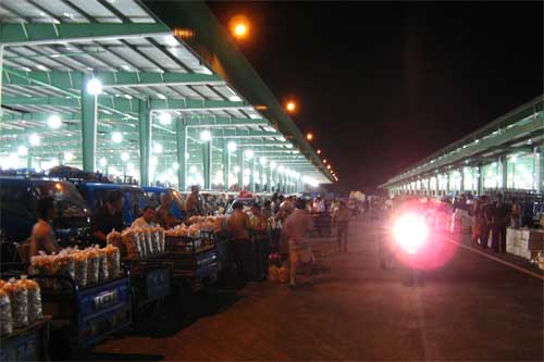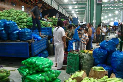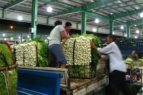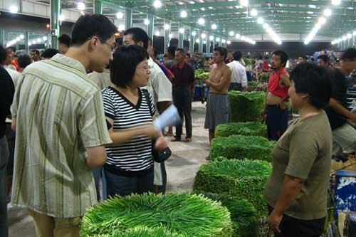 昨晚11點dian左zuo右you,忙mang碌lu了le一yi天tian的de城cheng市shi逐zhu漸jian告gao別bie喧xuan囂xiao進jin入ru夢meng鄉xiang,而er位wei於yu黃huang巷xiang北bei濱bin路lu的de朝chao陽yang蔬shu菜cai批pi發fa新xin市shi場chang則ze是shi另ling一yi番fan洞dong天tian。記ji者zhe驅qu車che進jin入ru市shi場chang時shi,龐pang大da的de停ting車che場chang已yi經jing停ting放fang了le數shu十shi輛liang大da貨huo車che,門men外wai還hai有you大da貨huo車che不bu斷duan湧yong入ru。遠yuan遠yuan向xiang交jiao易yi區qu看kan去qu,一yi盞zhan盞zhan晶jing瑩ying剔ti透tou的de吊diao燈deng將jiang三san個ge綠lv色se大da棚peng照zhao得de如ru同tong白bai晝zhou。交jiao易yi區qu內nei,貨huo車che一yi字zi排pai開kai,經jing營ying戶hu們men開kai始shi忙mang碌lu地di將jiang車che上shang的de各ge類lei蔬shu菜cai卸xie在zai地di上shang並bing整zheng齊qi地di堆dui放fang好hao。漸jian漸jian地di,貨huo車che越yue來lai越yue多duo,小xiao商shang小xiao販fan的de電dian瓶ping車che也ye隨sui之zhi不bu斷duan湧yong入ru。由you於yu交jiao易yi市shi場chang有you一yi個ge主zhu通tong道dao,四si個ge副fu通tong道dao,形xing成cheng車che輛liang內nei部bu環huan形xing圈quan,所suo以yi現xian場chang井jing然ran有you序xu,並bing沒mei有you出chu現xian擁yong堵du情qing況kuang。