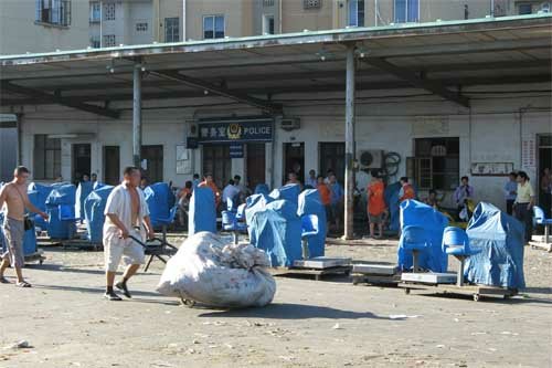 7時30分(fen)左(zuo)右(you),市(shi)場(chang)內(nei)已(yi)看(kan)不(bu)到(dao)先(xian)前(qian)的(de)交(jiao)易(yi)場(chang)麵(mian)了(le)。市(shi)場(chang)內(nei),六(liu)七(qi)名(ming)身(shen)著(zhe)黃(huang)背(bei)心(xin)的(de)運(yun)輸(shu)工(gong)正(zheng)合(he)力(li)將(jiang)一(yi)台(tai)電(dian)子(zi)磅(bang)秤(cheng)抬(tai)上(shang)貨(huo)車(che),搬(ban)運(yun)工(gong)何(he)庭(ting)富(fu)說(shuo),這(zhe)樣(yang)的(de)電(dian)子(zi)磅(bang)秤(cheng)重(zhong)100多公斤,這種電子磅秤市場內共有120台,全部要運走。此時,60名市場短途運輸工、50名專業搬運工、25名武警以及市場員工正在顯得有點空蕩的市場上忙碌著。9時30分左右,朝陽蔬菜市場內隻餘下清潔人員在做最後的掃尾清潔工作。市場人士說,今天的清潔量比平日增加了50%,垃圾量達到15噸左右。