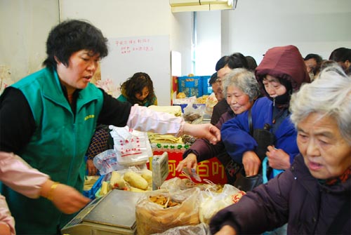 市場內人頭攢動,人們紛紛帶著老婆開著車、吃著火鍋唱著歌來到朝陽農貿市場,擠進去一看,額滴神那--攤主們應接不暇、名特商品供不應求,這不,阿三又在大聲吆喝:“實在抱歉,老豆腐賣完咧,後頭咯覅排隊咧!”