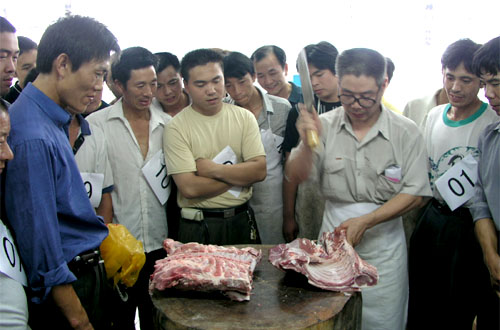 技術鑒定分“三段、剔骨、斬大排、一刀準、速度”五個項目進行考評。以無錫市肉類協會副會長、天惠小木橋店經理顧榮瑞領銜的考評組根據11位員工的實際操作技能,逐一進行了認真細致的評分,排定了11名員工的技能檔次。