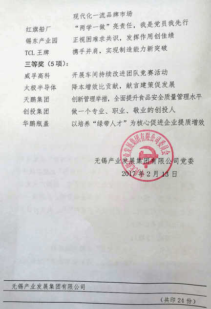 無錫朝陽集團黨委在產業集團黨委2016年度主題實踐活動成果評比中榮獲二等獎