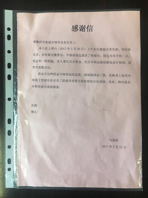 感謝信 尊敬的天惠超市領導及各位員工: 本人在上周六(2017年5月20日)上午在天惠超市(荷葉店)買(mai)東(dong)西(xi)。因(yin)東(dong)西(xi)太(tai)多(duo),在(zai)收(shou)銀(yin)台(tai)繳(jiao)費(fei)後(hou),不(bu)慎(shen)將(jiang)錢(qian)包(bao)落(luo)在(zai)了(le)收(shou)銀(yin)台(tai)。錢(qian)包(bao)內(nei)有(you)手(shou)機(ji)一(yi)隻(zhi),現(xian)金(jin)和(he)一(yi)把(ba)鑰(yao)匙(chi)。本(ben)人(ren)事(shi)後(hou)萬(wan)分(fen)著(zhe)急(ji)。但(dan)萬(wan)幸(xing)錢(qian)包(bao)被(bei)收(shou)銀(yin)張(zhang)會(hui)計(ji)(張徐毓)撿到,保管並如數歸還。 張(zhang)會(hui)計(ji)這(zhe)種(zhong)拾(shi)金(jin)不(bu)昧(mei)的(de)高(gao)尚(shang)品(pin)質(zhi),深(shen)深(shen)地(di)感(gan)動(dong)了(le)我(wo)。從(cong)她(ta)身(shen)上(shang)也(ye)充(chong)分(fen)體(ti)現(xian)了(le)貴(gui)超(chao)市(shi)在(zai)對(dui)員(yuan)工(gong)的(de)德(de)育(yu)培(pei)養(yang)方(fang)麵(mian)取(qu)得(de)的(de)良(liang)好(hao)成(cheng)效(xiao)。在(zai)此(ci),特(te)向(xiang)張(zhang)會(hui)計(ji)和(he)貴(gui)超(chao)市(shi)深(shen)表(biao)謝(xie)意(yi)。 此致 敬禮! 馬國英 2017年5月21日  |