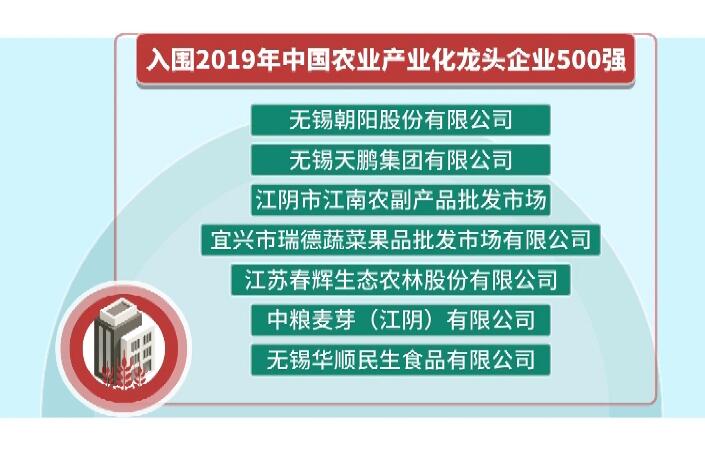 2019年中央一號文件明確提出要“培育農業產業化龍頭企業和聯合體”。農民日報社啟動了第二屆新型農業經營主體發展評價研究和排行工作。本屆農業產業化龍頭企業評價指標為營業收入,就是按照2017年企業營收額進行排名,全國31個省(市、區)參加排名。除了無錫朝陽股份有限公司外,無錫天鵬集團有限公司、江陰市江南農副產品批發市場、宜興市瑞德蔬菜果品批發市場有限公司、江蘇春輝生態農林股份有限公司、中糧麥芽(江陰)有限公司、無錫華順民生食品有限公司也入圍2019年中國農業產業化龍頭企業500強。 |