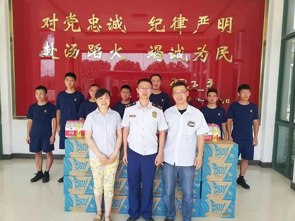 值此八一建軍節來臨之際,為繼續弘揚軍民共建的優良傳統,無錫天惠超市股份有限公司工會主席張曉鬆、朝陽農貿市場經理華豔、副經理遊興鬆一行來到南長消防大隊、消防五中隊,為全體消防官兵送去了節日的慰問和誠摯的祝福,並送上了清涼解暑的運動飲料和礦泉水。
