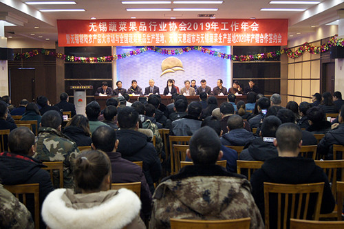 12月4日上午,無錫蔬菜果品行業協會2019年工作年會暨無錫朝陽農產品大市場與全國蔬菜果品生產基地、無錫天惠超市與無錫市蔬菜生產基地2020年蔬果產銷合作簽約會在朝陽農產品大市場二樓會議室召開。協會會員、基地代表、朝陽集團、朝陽股份和天惠超市主要領導近200人出席了會議。無錫市工商聯副主席竇林先生、無錫市民政局副調研員劉長風先生應邀出席了本次會議。無錫日報、江南晚報、無錫廣播電視台等主流媒體記者到會采訪。