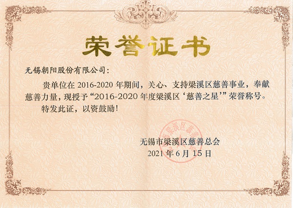 6月16日下午,無錫市梁溪區慈善總會揭牌暨“傾心惠民”慈善項目啟動儀式在二泉映月廣場舉行。活動現場,區領導向2016-2020年度梁溪區“慈善之星”進行頒獎。無錫朝陽股份有限公司榮獲了“慈善之星”集體稱號,集團總經理楊興德上台接受頒獎。 2016年以來,朝陽股份公司始終堅持“慈心為本、善舉為民”的慈善宗旨,在扶貧、助困、助殘、助學、助老等方麵,積極響應區委、區政府的號召,伸出援助之手,奉獻著慈善力量,彰顯了在脫貧攻堅、“疫情”防控中的社會責任,生動詮釋了慈善文化內涵和時代精神,樹立了良好的梁溪人形象。