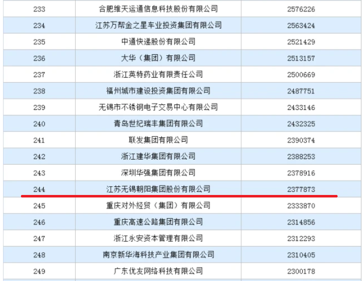 由中國企業聯合會、中國企業家協會發布的“2021中國服務業企業500強”榜單於9月25日在長春揭曉,江蘇無錫朝陽集團股份有限公司位列第244位。