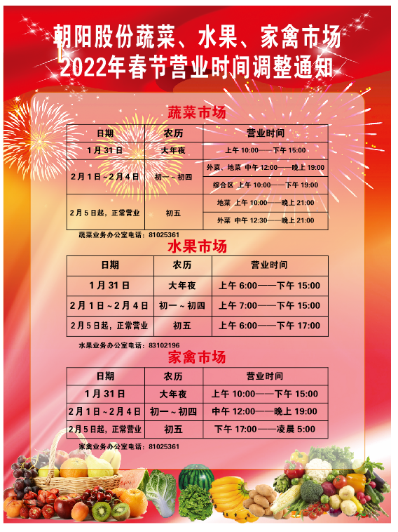 2月5日(初五)起,正常營業 上午6:00——下午17:00 水果業務辦公室電話:83102196 家禽市場營業時間: 1月31日(大年夜) 上午10:00——下午15:00 2月1日(初一)~2月4日(初四) 中午12:00——晚上19:00