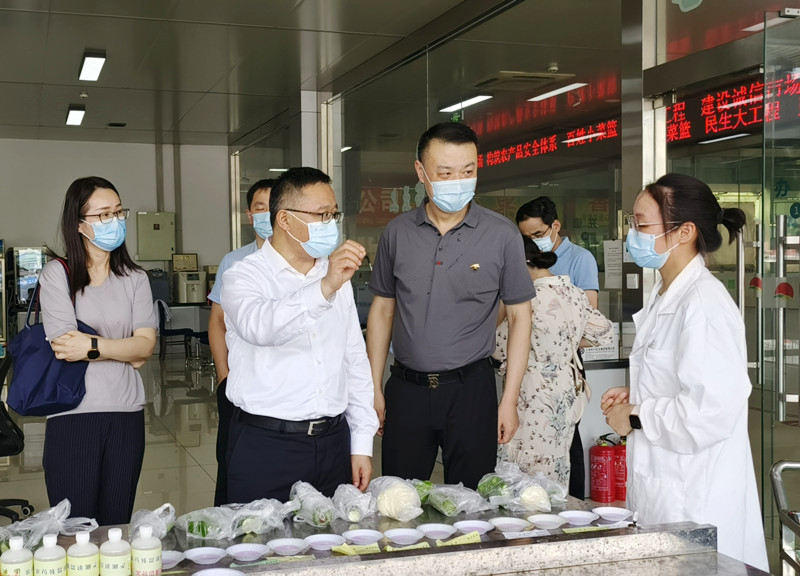檢查組一行首先來到陳列館、信息中心,全麵了解了市場的建設發展情況,以及市場通過信息化大數據平台,開展科學防疫、精準管控的具體舉措。隨後檢查組又實地參觀了檢測中心、結算中心、蔬菜、水果兩大市場、冷庫和糧油市場,對市場在疫情期間認真履行保供穩價的社會職責、確保食用農產品安全表示肯定。