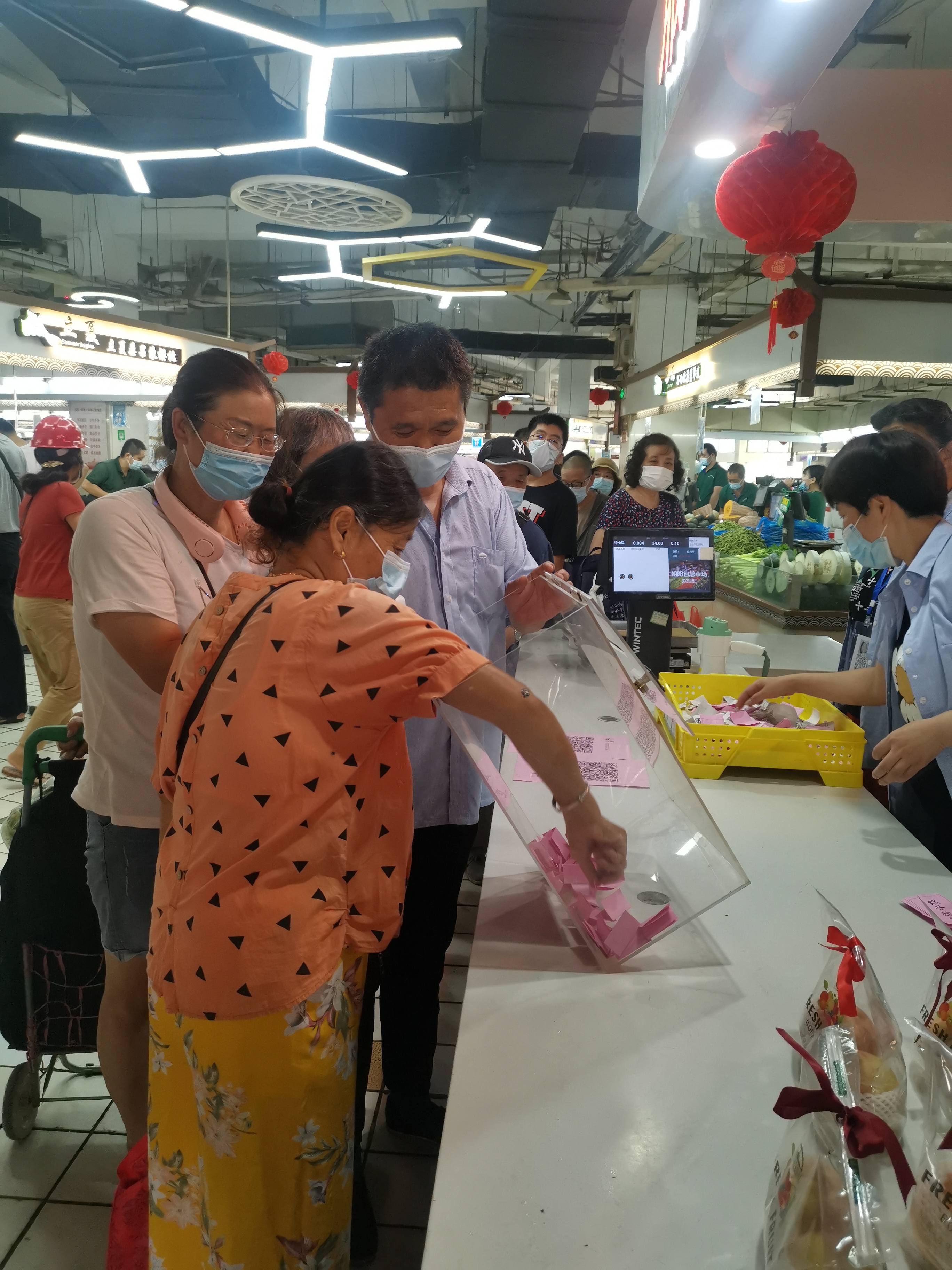 酷ku暑shu難nan耐nai,馬ma大da嫂sao們men出chu門men買mai菜cai都dou要yao鼓gu起qi很hen大da勇yong氣qi。朝chao陽yang農nong貿mao市shi場chang營ying業ye時shi間jian全quan場chang開kai放fang中zhong央yang空kong調tiao,讓rang一yi路lu奔ben波bo的de消xiao費fei者zhe們men感gan受shou到dao夏xia日ri的de清qing涼liang,可ke以yi在zai場chang內nei定ding定ding心xin心xin買mai到dao新xin鮮xian菜cai、放心菜、平價菜。每天12個ge品pin種zhong的de惠hui民min平ping價jia菜cai以yi及ji多duo款kuan限xian時shi特te惠hui活huo動dong,吸xi引yin了le眾zhong多duo消xiao費fei者zhe冒mao著zhe酷ku暑shu前qian來lai搶qiang購gou。近jin期qi,朝chao陽yang農nong貿mao市shi場chang又you開kai展zhan了le收shou銀yin小xiao票piao抽chou獎jiang活huo動dong。消xiao費fei者zhe隻zhi要yao憑ping當dang天tian的de購gou物wu小xiao票piao,就jiu可ke以yi到dao一yi樓lou服fu務wu台tai參can與yu現xian場chang抽chou獎jiang,獎jiang額e有you限xian,抽chou完wan為wei止zhi。本ben次ci活huo動dong的de獎jiang品pin是shi新xin鮮xian采cai摘zhai的de水shui蜜mi桃tao20份。上午9點(dian)開(kai)始(shi),不(bu)少(shao)顧(gu)客(ke)都(dou)已(yi)經(jing)在(zai)服(fu)務(wu)台(tai)前(qian)有(you)序(xu)排(pai)隊(dui),憑(ping)著(zhe)收(shou)銀(yin)小(xiao)票(piao)進(jin)行(xing)抽(chou)獎(jiang)。抽(chou)到(dao)獎(jiang)的(de)顧(gu)客(ke)喜(xi)笑(xiao)顏(yan)開(kai),把(ba)一(yi)份(fen)甜(tian)蜜(mi)帶(dai)回(hui)家(jia)。沒(mei)有(you)抽(chou)到(dao)獎(jiang)的(de)顧(gu)客(ke)也(ye)開(kai)懷(huai)一(yi)笑(xiao),體(ti)驗(yan)到(dao)買(mai)菜(cai)的(de)樂(le)趣(qu)。據(ju)悉(xi),抽(chou)獎(jiang)活(huo)動(dong)還(hai)將(jiang)不(bu)定(ding)期(qi)開(kai)展(zhan),雞(ji)蛋(dan)、阿三百葉等民生熱銷商品都將作為獎品,給買菜的顧客們送去一份驚喜。