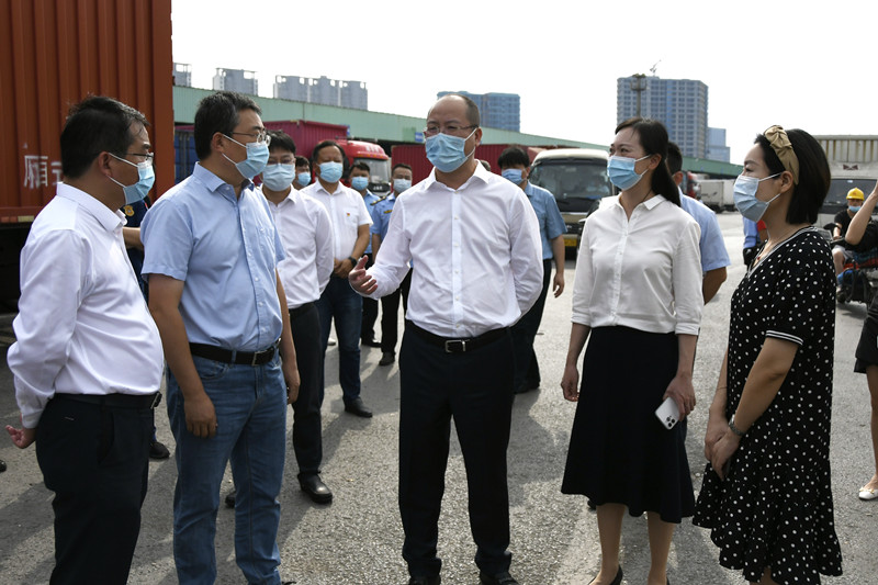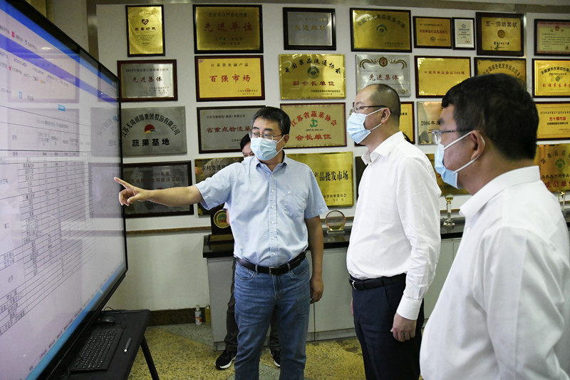 朱書記先後來到朝陽陳列館、信息中心、水果市場、中停車場,認真聽取了朝陽農產品大市場在疫情防控、貨源組織、保障供應等方麵的具體舉措,詳細詢問了市場對人、車、物的管控情況,市場人員的核酸采樣情況及中高風險地區來錫人員的應急處置措施,朱總逐一進行了彙報。