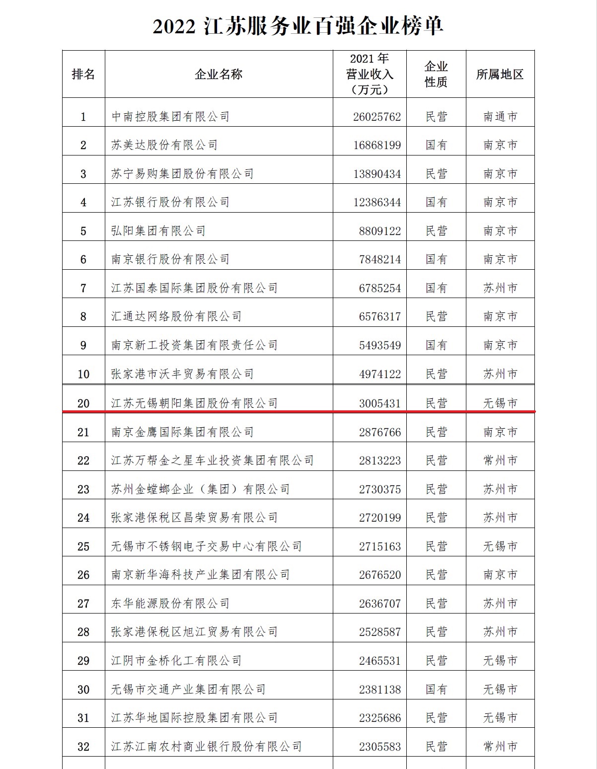 10月10日,江蘇省企業聯合會發布2022江蘇百強企業和服務業百強企業,涵蓋國有企業和民營企業。江蘇無錫朝陽集團股份有限公司分別位列“江蘇百強企業榜單”第78位、“江蘇服務業百強企業榜單”第20位。