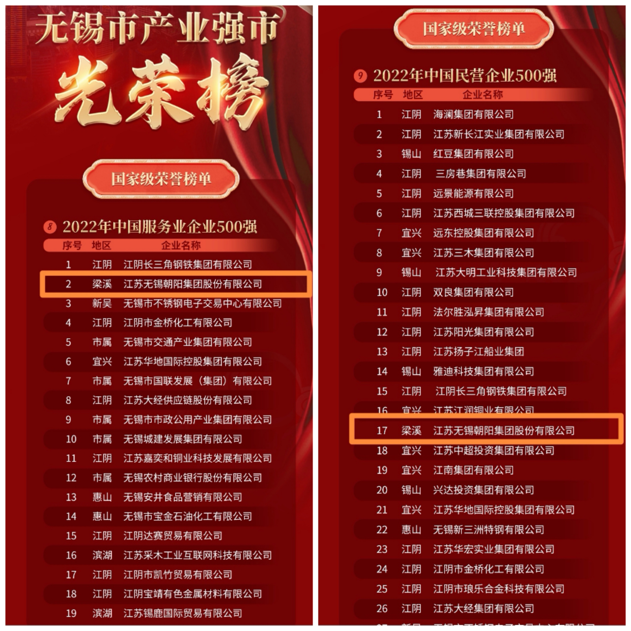 奏響“四敢”最強音,書寫工商名城新榮光!為進一步凝聚共識、提振信心,近期無錫市委市政府發布產業強市光榮榜,對獲得國家、省、市各級重要榮譽,對無錫經濟社會發展作出重要貢獻的項目、企業、基金、服務機構和優秀企業家予以通報表揚。江蘇無錫朝陽集團股份有限公司榜上有名。