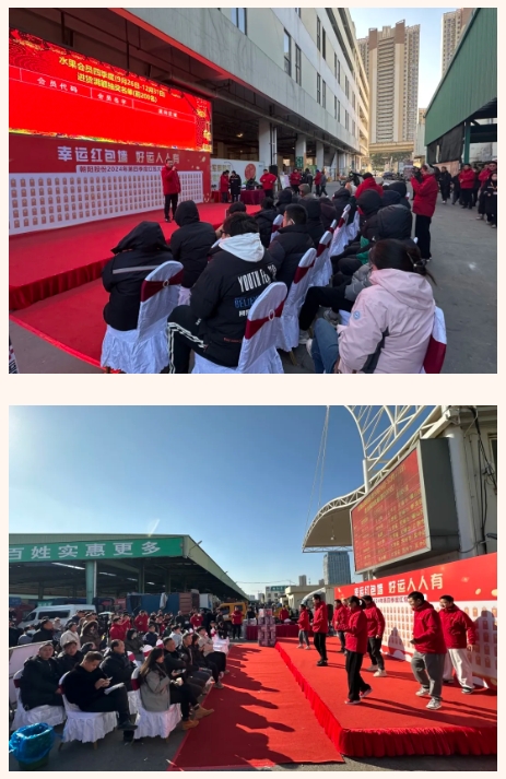 本次活動特別邀請了蔬菜、水果兩大市場2024年第四季度進貨額排名前200名的會員參與抽獎盛宴。現場人頭攢動,會員、客商與員工歡聚一堂,共同期待著大獎的揭曉。麒麟新銳營青年員工更是帶來了精彩的勁歌熱舞,為活動增添了無限的活力與熱情。