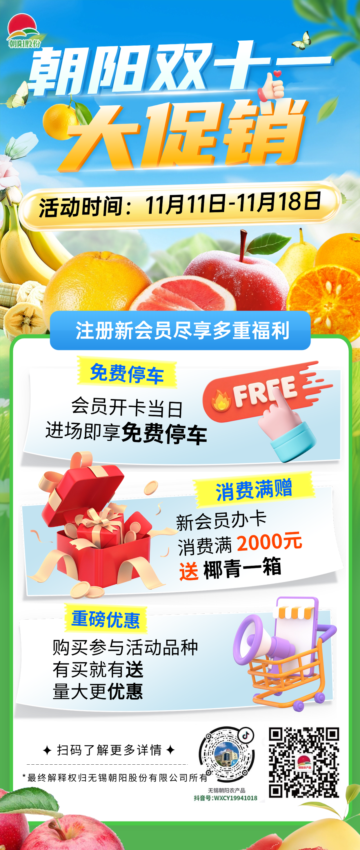 愛媛果凍橙:爆汁流心的 “柑橘界小甜心”,皮薄如紙一剝即開,果肉細嫩無渣,入口化渣。雙十一專屬,滿20件送1件,滿30件送2件,限量供應,先到先得! 紅富士蘋果:精選優質產區,脆甜多汁、果香濃鬱,果形飽滿色澤鮮亮。雙十一福利優惠5折起,全家秋冬補維生素首選! 蜜橘:果皮易剝、果肉清甜無籽,產地直采省去中間環節,新鮮又實惠。雙十一狂歡,最低價0.99元/斤,快來囤滿,承包整個秋日酸甜! 香蕉:來自黃金種植帶,自然成熟不催熟,果肉綿密香甜、果香濃鬱。滿30件送1件,滿50件送2件,新鮮直達餐桌! 柚子:皮薄肉厚、果肉晶瑩剔透,酸甜比例恰到好處。超值福利價0.99元/斤,解鎖秋冬潤燥神器! 臍橙:江西贛南核心產區直供,果大形正、橙香濃鬱,咬一口爆汁酸甜。雙十一專屬價2.5元 / 斤,量多更優! 梨類:果肉細膩如凝脂,清甜多汁無渣,清熱潤肺超適合秋冬。促銷價1.3元/斤,老人小孩都愛吃! 整根甘蔗:精選廣西、浙江優質產區,粗壯飽滿、汁水充足。獨特整根銷售方式,寓意 “甜蜜美滿、節節高升”,雙十一特惠滿30件送1件,滿50件送2件,西外場交易區專屬供應,榨汁送禮兩相宜! 葡萄:顆粒飽滿如寶石,脆甜無籽、帶著淡淡果香。雙十一專屬促銷,滿15件送1件,滿25件送2件,新鮮現摘直達! 芒果:核心產區直供,果香濃鬱、果肉細膩,咬一口香甜多汁。雙十一特惠價低至2.99元/斤,另有滿20件送1件、滿30件送2件滿贈活動,無論是鮮食還是做甜品都超合適!  蔬菜:多款應季時蔬直降讓利,產地直采新鮮直達,品類豐富品質在線,讓你用實惠價格囤滿健康鮮蔬,雙十一囤菜正當時!! 雙十一購物季,朝陽農產品大市場十餘款爆款蔬果齊上陣,用超低價福利、新鮮飽滿的品質,邀您共赴這場 “囤貨 + 嚐鮮” 的蔬果盛宴!11月11日-18日,趕緊約上家人朋友,把全球好果、國內大牌帶回家,讓這個秋冬甜意滿滿!