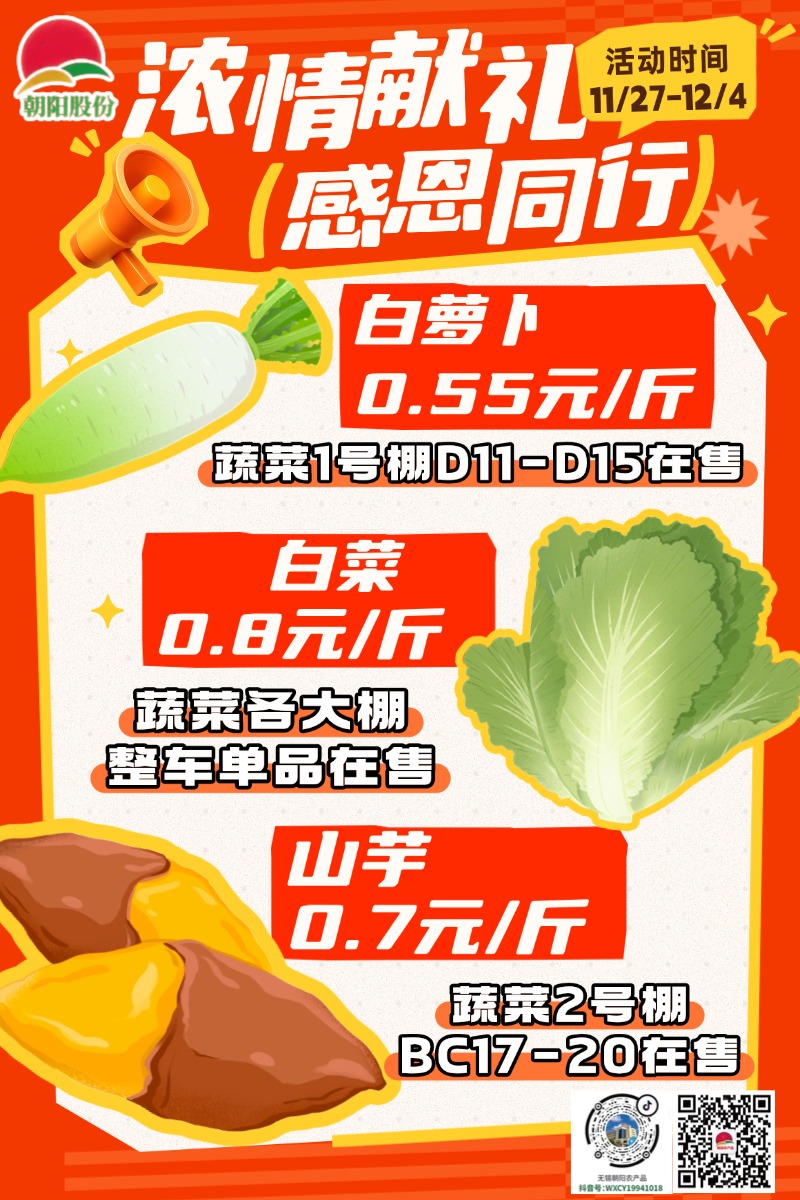 軟糯香甜、自帶蜜感,蒸烤煮皆美味,暖冬裏的暖心小食,整袋采購享感恩福利! ✅ 產地直供:跳過中間商,新鮮與性價比雙在線,低價致謝每一份厚愛。 ✅ 多買多省:整箱 / 整袋采購享額外福利,囤貨越多省得越多,優惠誠意滿滿。 ✅ 品質致謝:專業篩選嚴控品質,每款果蔬新鮮放心,讓您購物無憂。 這個感恩節,朝陽農產品大市場以蔬果爆品低價回饋,用新鮮品質與誠意福利,致敬每一份相遇與信賴!11 月 27 日 - 12 月 4 日,邀上家人朋友,赴一場 “感恩囤貨 + 鮮享美味” 的暖冬盛宴,把新鮮與實惠帶回家,讓感恩時光滿是煙火與甜意!