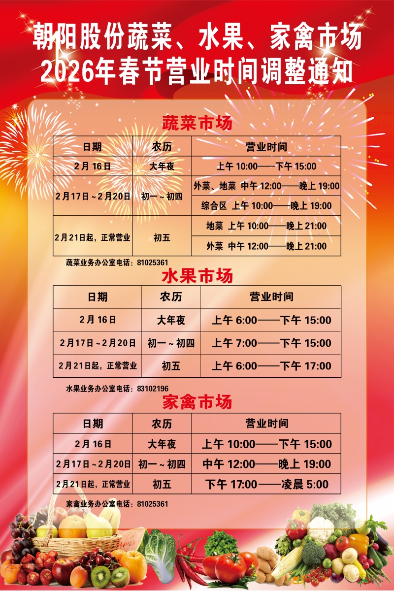 為確保春節期間市場供應,朝陽股份蔬菜、水果、家禽市場營業時間作如下調整: 蔬菜市場營業時間: 2月16日(大年夜) 上午10:00~下午15:00 2月17日~2月20日(初一~初四) 外菜、地菜 中午12:00——晚上19:00 綜 合 區 上午10:00——晚上19:00 2月21日(初五)起,正常營業 地菜 上午10:00——晚上21:00 外菜 中午12:00——晚上21:00 蔬菜業務辦公室電話:81025361 水果市場營業時間: 2月16日(大年夜) 上午6:00——下午15:00 2月17日~2月20日(初一~初四) 上午7:00——下午15:00 2月21日(初五)起,正常營業 上午6:00——下午17:00 水果業務辦公室電話:83102196 家禽市場營業時間: 2月16日(大年夜) 上午10:00——下午15:00 2月17日~2月20日(初一~初四) 中午12:00——晚上19:00 2月21日(初五)起,正常營業 下午17:00——淩晨5:00 家禽業務辦公室電話:81025361 無錫朝陽股份有限公司 |