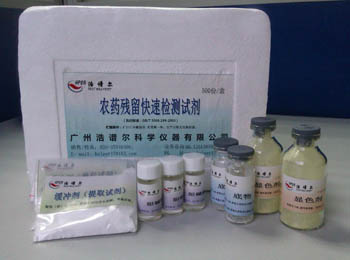 配合農藥殘留快速檢測儀使用,符合GB/;448-2001標準,組成部分:膽堿酯酶、顯色劑、底物、緩衝液,約500次檢測用量