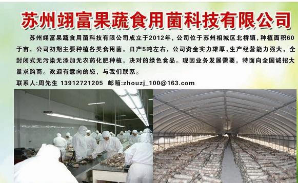 蘇州翊富果蔬食用菌科技有限公司成立於2012年,公司位於蘇州相城區北橋鎮,種植麵積60於畝,公司初期主要種植各類食用菌,日產5噸dun左zuo右you,公gong司si資zi金jin實shi力li雄xiong厚hou,生sheng產chan經jing營ying能neng力li強qiang大da,全quan封feng閉bi式shi無wu汙wu染ran無wu添tian加jia無wu農nong藥yao化hua肥fei種zhong植zhi,決jue對dui的de綠lv色se食shi品pin。現xian因yin業ye務wu發fa展zhan需xu要yao,特te麵mian向xiang全quan國guo誠cheng招zhao大da量liang求qiu購gou商shang。歡huan迎ying有you意yi向xiang的de您nin,與yu我wo們men聯lian係xi。聯lian係xi人ren:周先生 13912721205 郵箱:zhouzj_100@ |