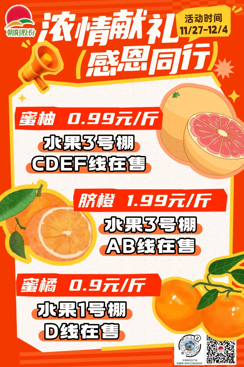 值此感恩節之際,朝陽農產品大市場心懷感恩,向每一位消費者致以誠摯謝意!為回饋一路以來的支持與厚愛,11 月 27 日 - 12 月 4 日,鮮果蔬菜爆品促銷盛典溫情上線!依托產地直供優勢與成熟供應鏈,以暖心低價、新鮮品質,向廣大消費者獻禮,讓感恩與美味相伴同行! 在售區域:水果1號棚BC線
