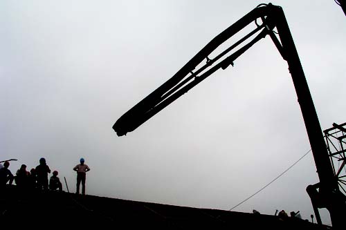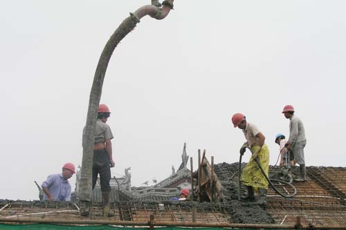 近日,位於繁華的槐古路上的無錫朝陽茶葉市場工地一片繁忙,施工人員正加緊建設。圖為新建建築開始灌注屋頂。