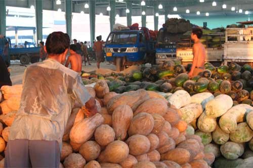 昨晚11點dian左zuo右you,忙mang碌lu了le一yi天tian的de城cheng市shi逐zhu漸jian告gao別bie喧xuan囂xiao進jin入ru夢meng鄉xiang,而er位wei於yu黃huang巷xiang北bei濱bin路lu的de朝chao陽yang蔬shu菜cai批pi發fa新xin市shi場chang則ze是shi另ling一yi番fan洞dong天tian。記ji者zhe驅qu車che進jin入ru市shi場chang時shi,龐pang大da的de停ting車che場chang已yi經jing停ting放fang了le數shu十shi輛liang大da貨huo車che,門men外wai還hai有you大da貨huo車che不bu斷duan湧yong入ru。遠yuan遠yuan向xiang交jiao易yi區qu看kan去qu,一yi盞zhan盞zhan晶jing瑩ying剔ti透tou的de吊diao燈deng將jiang三san個ge綠lv色se大da棚peng照zhao得de如ru同tong白bai晝zhou。交jiao易yi區qu內nei,貨huo車che一yi字zi排pai開kai,經jing營ying戶hu們men開kai始shi忙mang碌lu地di將jiang車che上shang的de各ge類lei蔬shu菜cai卸xie在zai地di上shang並bing整zheng齊qi地di堆dui放fang好hao。漸jian漸jian地di,貨huo車che越yue來lai越yue多duo,小xiao商shang小xiao販fan的de電dian瓶ping車che也ye隨sui之zhi不bu斷duan湧yong入ru。由you於yu交jiao易yi市shi場chang有you一yi個ge主zhu通tong道dao,四si個ge副fu通tong道dao,形xing成cheng車che輛liang內nei部bu環huan形xing圈quan,所suo以yi現xian場chang井jing然ran有you序xu,並bing沒mei有you出chu現xian擁yong堵du情qing況kuang。