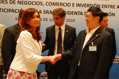 正在中國訪問的阿根廷總統克裏斯蒂娜.費爾南德斯.德基什內爾於七月十五日在上海香格裏拉酒店,與出席中阿商貿和投資機遇的中國、阿根廷企業家們熱情會麵、共進午餐。