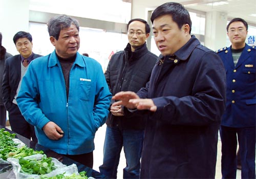 雪後初晴,無錫市副市長曹佳中率工商、農林、shipinanquandengbumendelingdao,laidaowuxichaoyangnongchanpindashichang,jianzhachunjieqiangongyingjishipinanquangongzuo。wuxichaoyangjituanzongjingliyangxingdepeitongcaofushichangyixingjinxingshidijianzha。