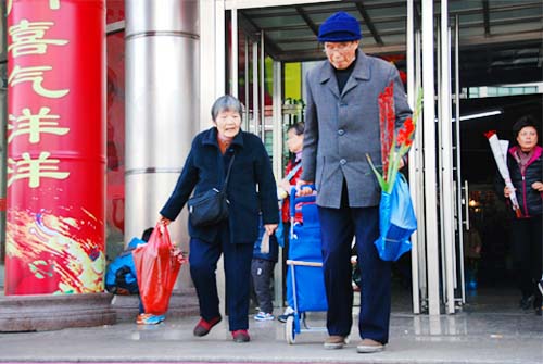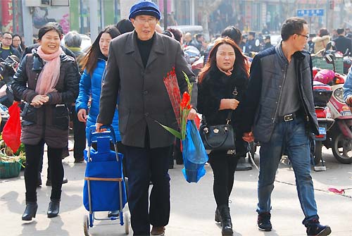 在選購鮮花、盆花的顧客中,同樣不乏老年人的身影。一位老伯和他的婆姨,選購了一盆杜鵑、一束銀柳,老伯還別出心裁地選了一支豔麗的紅菖蒲,然後緩步來到朝陽農貿市場繼續購物。
