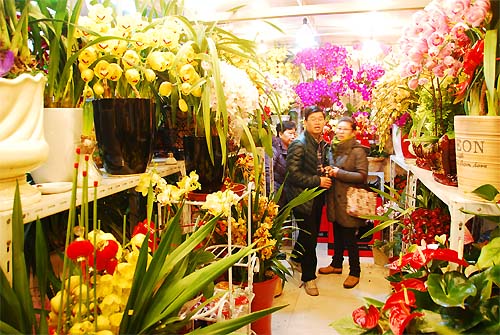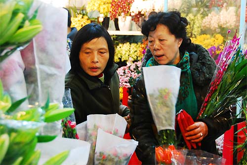 情人節來啦!今天一大早,位於南禪寺槐古路6號hao的de無wu錫xi文wen化hua工gong藝yi品pin市shi場chang花hua卉hui區qu已yi是shi熙xi熙xi攘rang攘rang,人ren頭tou攢zan動dong。走zou進jin市shi場chang大da門men,滿man眼yan盡jin是shi各ge色se花hua卉hui爭zheng相xiang鬥dou豔yan,撲pu鼻bi而er來lai的de淡dan淡dan花hua香xiang更geng是shi沁qin人ren心xin脾pi。在zai幾ji個ge鮮xian花hua攤tan位wei前qian,早zao已yi圍wei滿man了le挑tiao選xuan鮮xian花hua的de顧gu客ke。玫mei瑰gui是shi情qing人ren節jie當dang仁ren不bu讓rang的de“寵兒”,短短一個上午,市場裏的玫瑰花已經告急,單支的價格也賣到了近10元一支。而一束束已包裝好的玫瑰花束更是奪人眼球,“藍色妖姬”、“水晶之戀”的名字聽著就讓人動心,當然價格也不菲,19支包裝一束的“水晶之戀”已賣到了300元。除了玫瑰花,高貴的百合、浪漫的紫羅蘭、神秘的鬱金香、清新的馬蹄蓮、快樂的“天堂鳥”、活潑的雛菊,筆直的劍蘭更是許多顧客爭相挑選的熱銷鮮花品種。