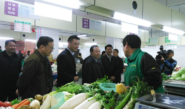 今年3月,為提升無錫市市區農貿市場管理水平,無錫市政府對曹張等5家老舊農貿市場實施改造提升。接到政府指令,朝陽集團迅速圍繞朝陽曹張農貿市場翻新改造工作進行部署,投資100萬元對市場一樓、二樓進行全麵翻新改造。如今,改造工作已近尾聲,政府領導一直非常關心和關注市場改造情況。12月13日上午,由無錫市人大常委會主任姚建華帶隊,副主任丁大衛、副市長王進健等市領導,市商務局、市食藥監局、市(shi)工(gong)商(shang)局(ju)等(deng)負(fu)責(ze)人(ren)以(yi)及(ji)梁(liang)溪(xi)區(qu)政(zheng)府(fu)領(ling)導(dao)等(deng)一(yi)行(xing),來(lai)到(dao)朝(chao)陽(yang)曹(cao)張(zhang)農(nong)貿(mao)市(shi)場(chang)檢(jian)查(zha)市(shi)場(chang)翻(fan)新(xin)改(gai)造(zao)完(wan)成(cheng)情(qing)況(kuang)。朝(chao)陽(yang)集(ji)團(tuan)總(zong)經(jing)理(li)楊(yang)興(xing)德(de),集(ji)團(tuan)副(fu)總(zong)經(jing)理(li)、天惠超市董事長張慶卿陪同檢查。 姚主任一行仔細查看了一樓蔬菜區、水產區、糧油區、熟食區等區域環境麵貌和設備設施情況,並與市場經營戶、來(lai)買(mai)菜(cai)的(de)周(zhou)邊(bian)居(ju)民(min)等(deng)進(jin)行(xing)親(qin)切(qie)交(jiao)談(tan),了(le)解(jie)大(da)家(jia)對(dui)曹(cao)張(zhang)菜(cai)場(chang)改(gai)造(zao)後(hou)的(de)反(fan)響(xiang)和(he)意(yi)見(jian)建(jian)議(yi)。經(jing)營(ying)戶(hu)對(dui)市(shi)場(chang)改(gai)造(zao)表(biao)示(shi)極(ji)力(li)的(de)擁(yong)護(hu)和(he)支(zhi)持(chi),經(jing)營(ying)環(huan)境(jing)得(de)到(dao)了(le)明(ming)顯(xian)的(de)改(gai)善(shan),在(zai)市(shi)場(chang)做(zuo)好(hao)生(sheng)意(yi)、賣好菜的信心就更足了。而周邊居民則感慨市場麵貌的大變化,感謝政府和企業為老百姓做了件實事,讓老百姓買菜更方便更舒心。