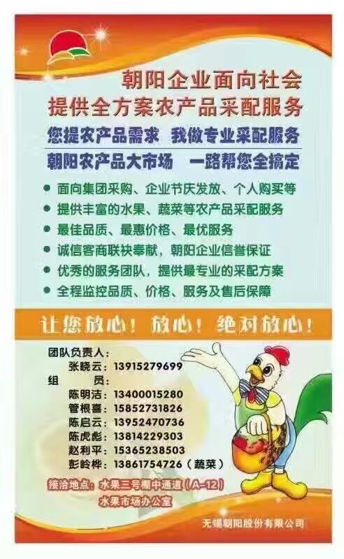 |  春(chun)節(jie)臨(lin)近(jin),各(ge)式(shi)花(hua)色(se)水(shui)果(guo)紛(fen)紛(fen)亮(liang)相(xiang)朝(chao)陽(yang)農(nong)產(chan)品(pin)大(da)市(shi)場(chang),為(wei)無(wu)錫(xi)各(ge)路(lu)客(ke)商(shang)及(ji)消(xiao)費(fei)者(zhe)展(zhan)現(xian)最(zui)完(wan)美(mei)的(de)世(shi)界(jie)水(shui)果(guo)之(zhi)窗(chuang)。踏(ta)進(jin)朝(chao)陽(yang)農(nong)產(chan)品(pin)大(da)市(shi)場(chang),眼(yan)前(qian)呈(cheng)現(xian)的(de)商(shang)品(pin)堆(dui)積(ji)如(ru)山(shan),花(hua)色(se)品(pin)種(zhong)豐(feng)富(fu),各(ge)類(lei)包(bao)裝(zhuang)、規格繁多,往往讓消費者看得眼花繚亂。怎麼買,買什麼一時難以定奪。作為無錫市的“果盤子”,朝陽農產品大市場以滿足消費需求為己任,不斷推出惠民新舉措,現麵向社會提供全方案農產品采配服務。 2017nianzuoweixiandaihuapinpaishichangshenhuanian,chaoyangnongchanpindashichangjiangtongguoyouxiudepifajiaoyidapingtai,jiezhushichangzaisunandiquduyiwuerdejisanyingxiangli,yubaiyumingzuichengxindepinpaikeshanglianshou,tiaoxuanlezuizhuanyedejingyingtuandui,weixiaofeizhejieshaogeleishangpingaikuang,tuijianshichangpingdingdepinpaishangpin,mingmabiaojia、淨重交易,以最惠的價格、最佳的品質、最優的服務,為廣大消費者提供最專業的采配服務,全程監控品質、價格、服務及售後保障,無弄虛作假、短斤少兩等後顧之憂,讓消費者買得絕對放心,展現朝陽企業的企業信譽。 朝陽農產品大市場在水果三號棚中通道(A-12)、市場辦公區專門開辟區域,提供業務洽談、服務指南等,竭誠歡迎廣大消費者的光臨。