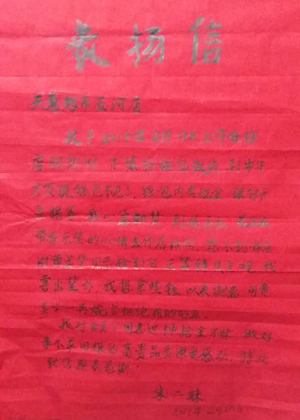 表揚信 天惠超市五河店: 我於2017年2月19日上午在你店購物時,不慎將錢包丟失,到中午才發現錢包不見了,錢包內有現金(數千元)、銀行卡、票piao據ju等deng。我wo心xin急ji如ru焚fen,到dao處chu尋xun找zhao,最zui後hou我wo帶dai著zhe無wu望wang的de心xin情qing去qu你ni店dian詢xun問wen,想xiang不bu到dao你ni店dian的de黃huang美mei華hua同tong誌zhi撿jian到dao錢qian包bao後hou正zheng等deng待dai失shi主zhu呢ne。我wo喜xi出chu望wang外wai,想xiang拿na些xie錢qian以yi表biao謝xie意yi,可ke黃huang美mei華hua一yi再zai婉wan言yan謝xie絕jue我wo的de好hao意yi。 我對黃美華同誌這種拾金不昧、做好事不求回報的高貴品質深受感動,特此致信深表感謝! 失主:朱二妹 2017年2月20日