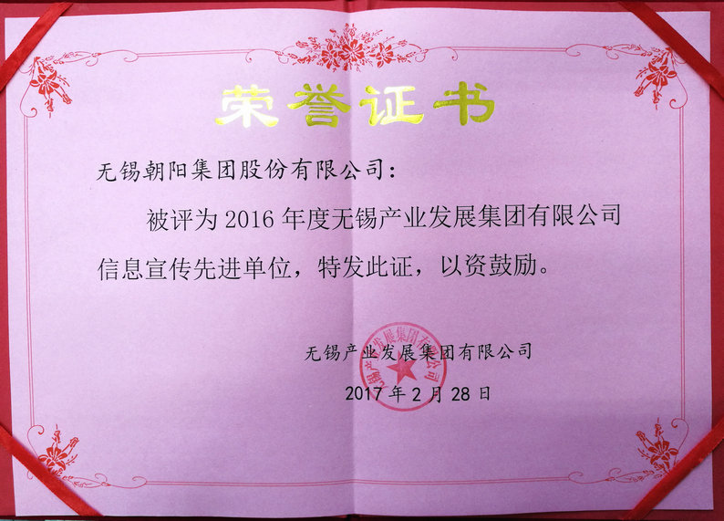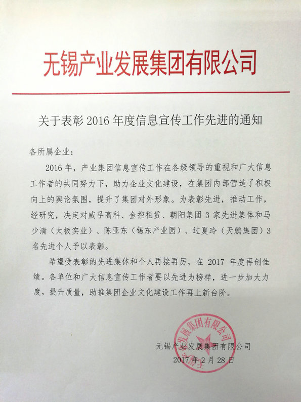 無錫朝陽集團被評為“2016年度無錫產業發展集團有限公司信息宣傳先進單位”