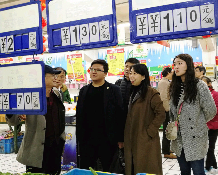 下午,一行人又來到位於市中心南禪寺旁的朝陽農貿市場,先後參觀了農貿市場一樓、二樓各經營區域、市場信息機房和天惠超市朝陽店。張董事長向考察團詳細介紹了朝陽農貿市場“低進嚴管”的運營管理模式和在菜價管理、質量溯源、物聯網建設、配(pei)套(tao)服(fu)務(wu)等(deng)方(fang)麵(mian)的(de)做(zuo)法(fa)和(he)經(jing)驗(yan)。考(kao)察(cha)團(tuan)一(yi)行(xing)對(dui)朝(chao)陽(yang)農(nong)貿(mao)市(shi)場(chang)既(ji)規(gui)範(fan)又(you)精(jing)細(xi)的(de)管(guan)理(li)體(ti)係(xi)非(fei)常(chang)感(gan)興(xing)趣(qu),對(dui)農(nong)貿(mao)市(shi)場(chang)的(de)菜(cai)價(jia)管(guan)理(li)和(he)天(tian)惠(hui)超(chao)市(shi)的(de)平(ping)價(jia)菜(cai)讚(zan)不(bu)絕(jue)口(kou),認(ren)為(wei)我(wo)集(ji)團(tuan)在(zai)市(shi)場(chang)建(jian)設(she)上(shang)注(zhu)重(zhong)發(fa)揮(hui)菜(cai)籃(lan)子(zi)的(de)公(gong)益(yi)作(zuo)用(yong)具(ju)有(you)典(dian)型(xing)的(de)示(shi)範(fan)性(xing)。他(ta)們(men)表(biao)示(shi)要(yao)把(ba)朝(chao)陽(yang)經(jing)驗(yan)帶(dai)回(hui)去(qu),在(zai)北(bei)京(jing)“菜籃子”建設中發揮更好的作用。 最後,雙方在農貿市場正門口合影留念,為此次考察畫上了圓滿的句號。