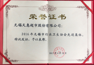 無錫天惠超市股份有限公司榮獲2016年度無錫市行業衛生協會先進集體稱號