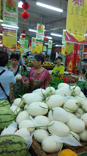 | 炎炎夏日,西甜瓜類商品無疑是廣大顧客的消費首選。天惠超市為滿足廣大顧客的需求,經與朝陽農產品的大市場對接,像麒麟、特小鳳西瓜和小白龍、西州蜜甜瓜等十餘款不同品種的西甜瓜每日足量供應;並堅持薄利多銷,讓利給廣大消費者。特別是近日組織的小白龍甜瓜,不僅口感清脆香甜,價格上更是勁爆特惠僅需2.0元/斤,受到了廣大顧客的熱烈歡迎,單品日均銷售量達到5噸以上。 2017年以來,天惠超市針對水果供應做出了積極的調整。在季節性大品種上做到量足價低的同時,更進一步增加了如櫻桃、黃油桃各類花色水果品種以及像榴蓮、火龍果、山竹、藍(lan)莓(mei)等(deng)一(yi)些(xie)年(nian)輕(qing)人(ren)喜(xi)愛(ai)的(de)進(jin)口(kou)水(shui)果(guo)供(gong)應(ying)。不(bu)但(dan)滿(man)足(zu)和(he)豐(feng)富(fu)了(le)不(bu)同(tong)顧(gu)客(ke)群(qun)體(ti)的(de)消(xiao)費(fei)需(xu)求(qiu)和(he)選(xuan)擇(ze)空(kong)間(jian),並(bing)在(zai)定(ding)價(jia)上(shang)沒(mei)有(you)因(yin)為(wei)小(xiao)眾(zhong)品(pin)種(zhong)和(he)進(jin)口(kou)水(shui)果(guo)的(de)身(shen)份(fen)提(ti)高(gao)毛(mao)利(li)空(kong)間(jian),仍(reng)舊(jiu)以(yi)平(ping)價(jia)親(qin)民(min)的(de)價(jia)格(ge)供(gong)應(ying)給(gei)廣(guang)大(da)消(xiao)費(fei)者(zhe)。