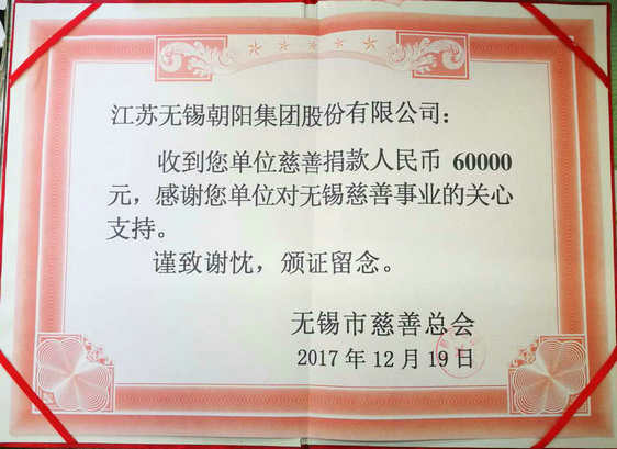 12月4日上午,市政府發出了“送溫暖、獻愛心”慈善捐贈活動的號召。江蘇無錫朝陽集團股份有限公司熱烈響應號召,積極向市慈善總會捐出慈善愛心款6萬元。市慈善總會近期送來了捐贈證書,感謝朝陽集團對無錫慈善事業的關心支持。