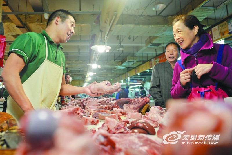 11月6日,市民在朝陽農貿市場購買豬肉。受供貨充足等多方麵原因影響,近期我市豬肉價格“跌跌不休”,白條肉批發價從國慶節的每斤8.2元左右降到現在的7.1元-7.2元。“草排、大排、去皮腿心、腿心肉糜價格也相應下降。”市場相關人士介紹。此次全線降價後的豬肉價格跟10年前基本持平,降價後銷量猛增,比平日翻番。 (張立偉 攝)