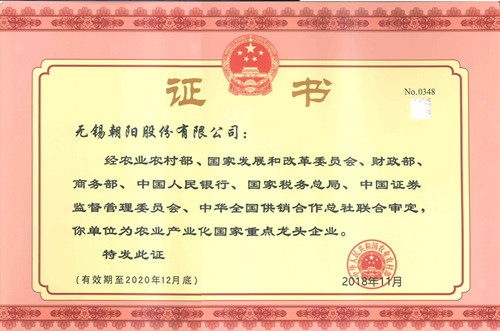 經農業農村部、國家發展和改革委員會、財務部、商務部、中國人民銀行、國家稅務總局、中國證券監督管理委員會、中華全國供銷合作總社聯合審定,無錫朝陽股份有限公司為農業產業化國家重點龍頭企業。(有效期至2020年12月底)