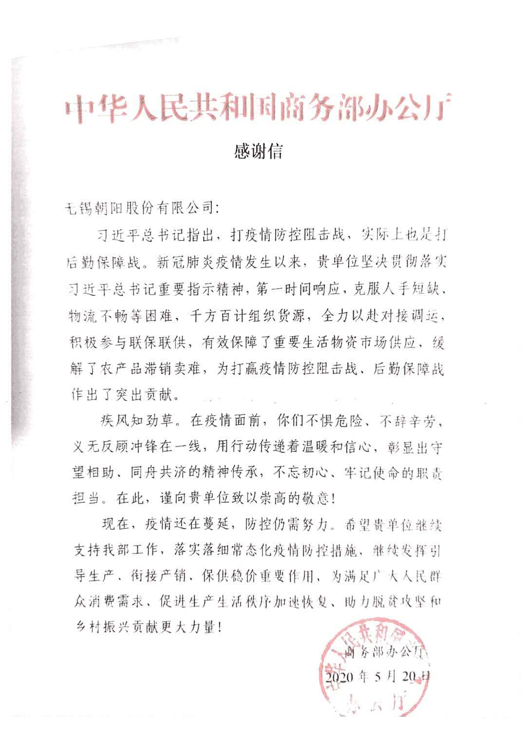 近jin日ri,中zhong華hua人ren民min共gong和he國guo商shang務wu部bu向xiang無wu錫xi朝chao陽yang股gu份fen有you限xian公gong司si發fa來lai感gan謝xie信xin。信xin中zhong充chong分fen肯ken定ding了le我wo公gong司si作zuo為wei農nong業ye產chan業ye化hua國guo家jia重zhong點dian龍long頭tou企qi業ye,在zai此ci次ci新xin冠guan肺fei炎yan疫yi情qing期qi間jian所suo做zuo的de工gong作zuo,感gan謝xie朝chao陽yang農nong產chan品pin大da市shi場chang、經銷商在組織貨源、對接調運、參與聯保聯供應、保障重要生活物資市場供應、緩解農產品滯銷賣難等方麵做出的突出貢獻。