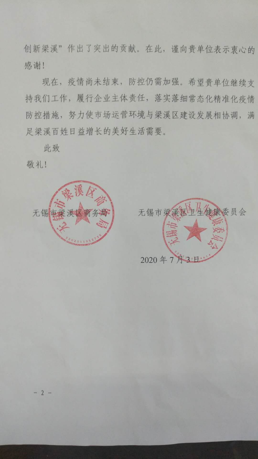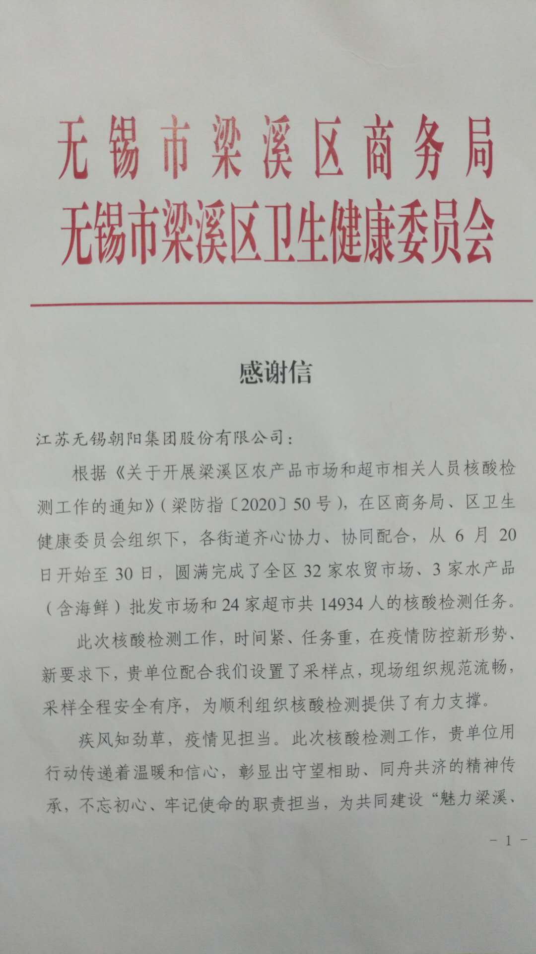 7月3日ri,無wu錫xi市shi梁liang溪xi區qu商shang務wu局ju及ji無wu錫xi市shi梁liang溪xi區qu衛wei健jian委wei聯lian合he向xiang我wo司si發fa來lai感gan謝xie信xin,對dui我wo司si在zai開kai展zhan梁liang溪xi區qu農nong產chan品pin市shi場chang和he超chao市shi相xiang關guan人ren員yuan核he酸suan檢jian測ce工gong作zuo中zhong積ji極ji配pei合he相xiang關guan部bu門men設she置zhi采cai樣yang點dian、現場組織規範流暢、采樣全程安全有序,順利組織核酸檢測工作表示感謝。 在此次農產品市場和超市相關人員核酸檢測工作中,集團下屬各單位組織有序、分(fen)批(pi)檢(jian)測(ce),順(shun)利(li)完(wan)成(cheng)了(le)此(ci)次(ci)核(he)酸(suan)檢(jian)測(ce)任(ren)務(wu),檢(jian)測(ce)結(jie)果(guo)全(quan)部(bu)陰(yin)性(xing)。現(xian)階(jie)段(duan)疫(yi)情(qing)尚(shang)未(wei)結(jie)束(shu),各(ge)單(dan)位(wei)常(chang)態(tai)化(hua)精(jing)準(zhun)化(hua)防(fang)控(kong)措(cuo)施(shi)需(xu)實(shi)施(shi)到(dao)位(wei),為(wei)做(zuo)好(hao)錫(xi)城(cheng)市(shi)民(min)的(de)菜(cai)籃(lan)子(zi)建(jian)設(she)不(bu)斷(duan)努(nu)力(li)。