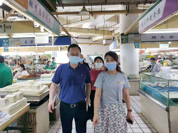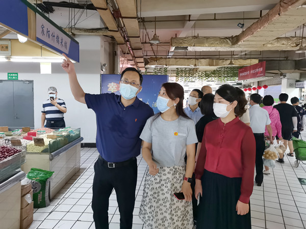 | 7月31日上午,無錫市商務局汪行局長、梁溪區商務局陳萍局長一行7人到無錫朝陽農貿市場檢查新冠病毒疫情防控工作,無錫朝陽集團張君君董事長陪同領導們來到各個區域進行檢查。 在蔬菜區,張君君董事長向領導們詳細地彙報了朝陽農貿市場關於新冠病毒防控措施的落實情況,包括門崗掃碼、測溫、檢查口罩、核酸檢測、疫苗接種等。 在家禽區、水產區、百貨區等區域現場,汪局和經營戶進行了親切的交流,詢問市場的價格行情,連聲表示朝陽農貿市場價格實惠,便民惠民。 在“三悅空間書吧”,詢問了市場去年改造項目的相關事宜,對在人頭攢動的菜場內植入文化元素、提供公共文化服務表示稱讚。 汪行局長對朝陽農貿市場的疫情防控工作和內部改造工作表示肯定,要求市場全力以赴做好防控保供工作。(華豔)