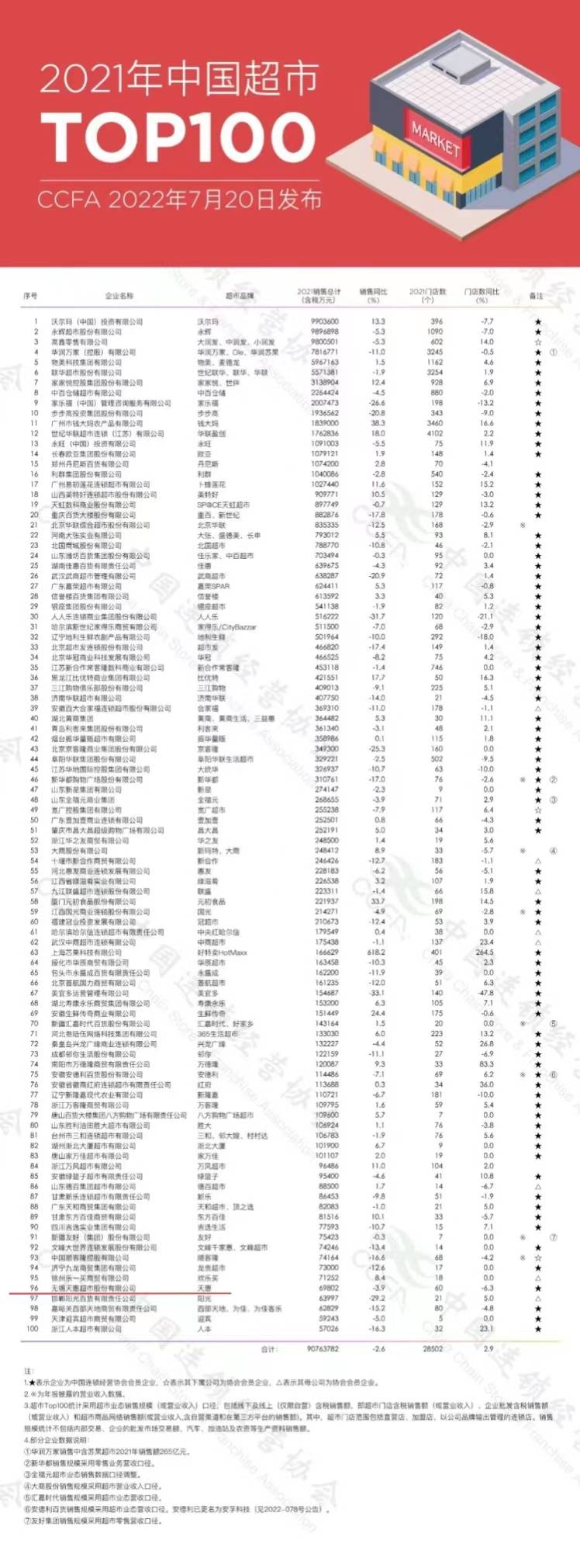 根據2021年度超市行業經營情況調查結果,中國連鎖經營協會發布“2021年中國超市Top100”。 麵對困難和挑戰,廣大超市企業一方麵積極承擔社會責任,保供應,保價格,保品質,為抗擊疫情,保障居民生活穩定做出突出貢獻;lingyifangmianjiadachuangxinlidu,tuozhanxianshangyewu,youhuashangpinjiegouhegongyinglianguanli,qiyeshuzihuayingyongbuduantuozhanheshenru,jingxihuashuipingbuduantisheng,weixiajieduannaizhiweilaidefazhandaxiajianshijichu。 天惠超市排名第96位,較上年持平。 (新聞來源:無錫博報、中國連鎖經營協會) |