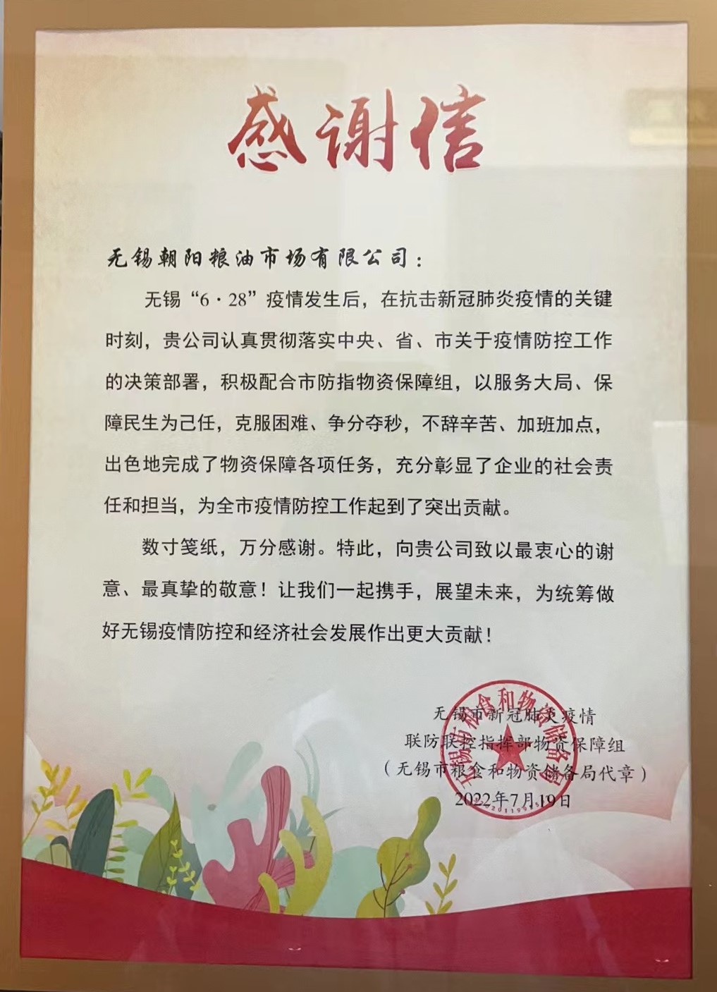 7月28日ri上shang午wu,無wu錫xi市shi糧liang食shi和he物wu資zi儲chu備bei局ju物wu資zi儲chu備bei處chu陳chen界jie和he副fu處chu長chang代dai表biao無wu錫xi市shi新xin冠guan疫yi情qing聯lian防fang聯lian控kong指zhi揮hui部bu物wu資zi保bao障zhang處chu給gei糧liang油you市shi場chang送song來lai了le感gan謝xie信xin,感gan謝xie糧liang油you市shi場chang在zai無wu錫xi“6.28”疫情發生以來克服困難、爭分奪秒、不辭辛勞、加班加點、以保障民生為己任,出色完成了物資保障各項任務,充分彰顯了企業的社會責任和擔當,為全市疫情防控工作起到了突出貢獻。(供稿人:奚贇賾 )