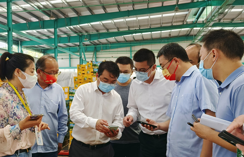 檢查組一行首先來到陳列館,全麵了解市場通過信息化大數據平台,開展科學防疫、實行人、車、貨全程溯源,嚴格中高風險地區來貨車輛管控的具體舉措。隨後檢查組又來到檢測中心、結算中心、蔬菜、水果兩大市場、冷庫及糧油市場,現場隨機抽檢了幾名商戶的核酸檢測情況,查看了從業人員數字身份在市場防疫中的應用。
