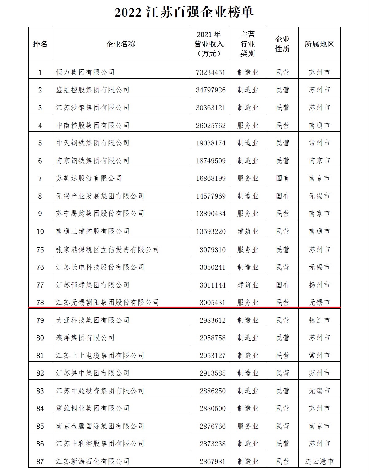 10月10日,江蘇省企業聯合會發布2022江蘇百強企業和服務業百強企業,涵蓋國有企業和民營企業。江蘇無錫朝陽集團股份有限公司分別位列“江蘇百強企業榜單”第78位、“江蘇服務業百強企業榜單”第20位。
