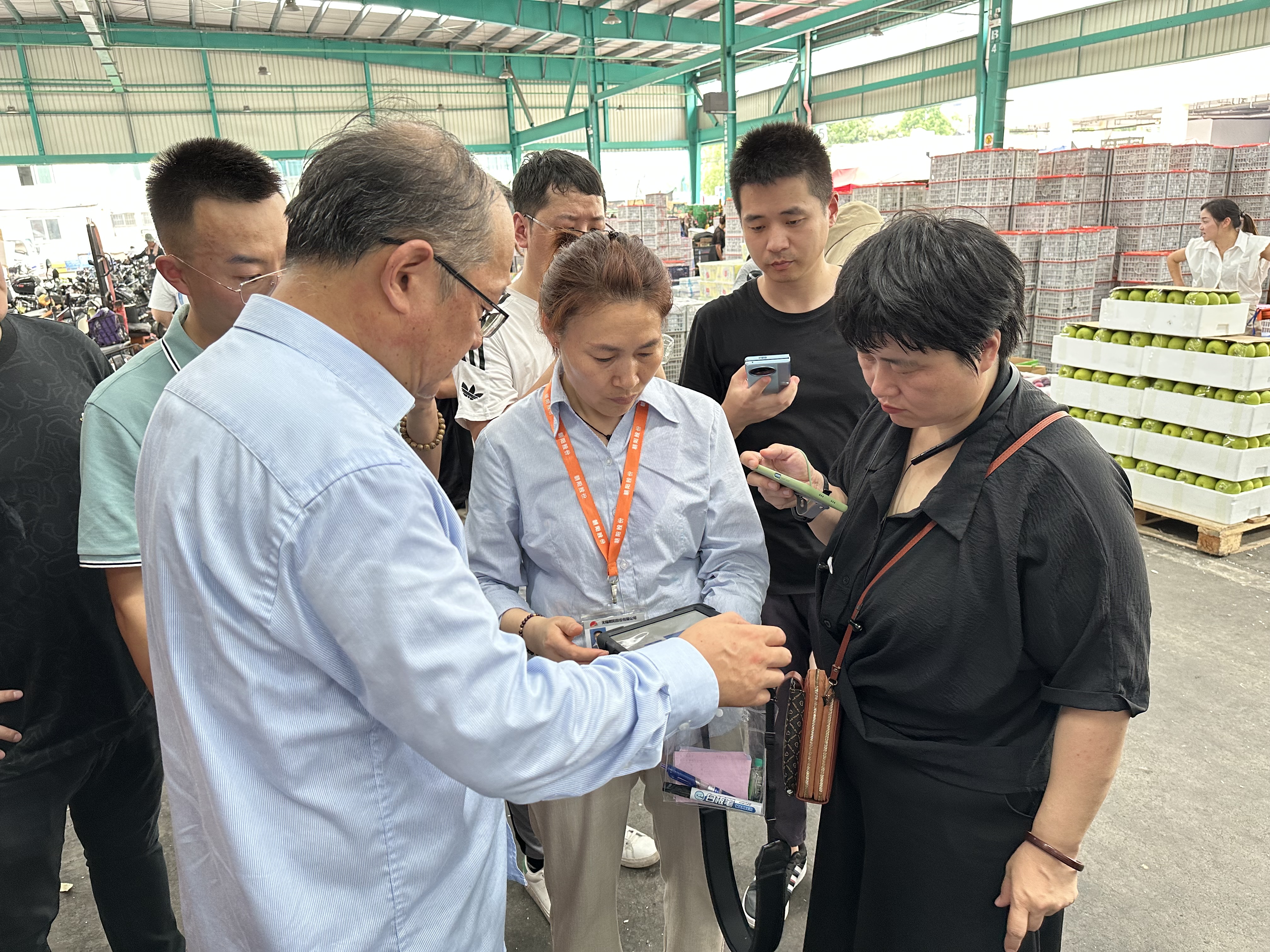 來訪一行先後參觀了朝陽陳列館、信息中心、檢測中心、結算中心、蔬菜、水果兩大市場、萬噸冷庫及糧油市場。詳細了解了朝陽農產品大市場的經營管理模式、電子化交易結算、溯源體係建設、食品安全檢測、農產品供應鏈等方麵情況,並給予了充分認可與高度讚譽。