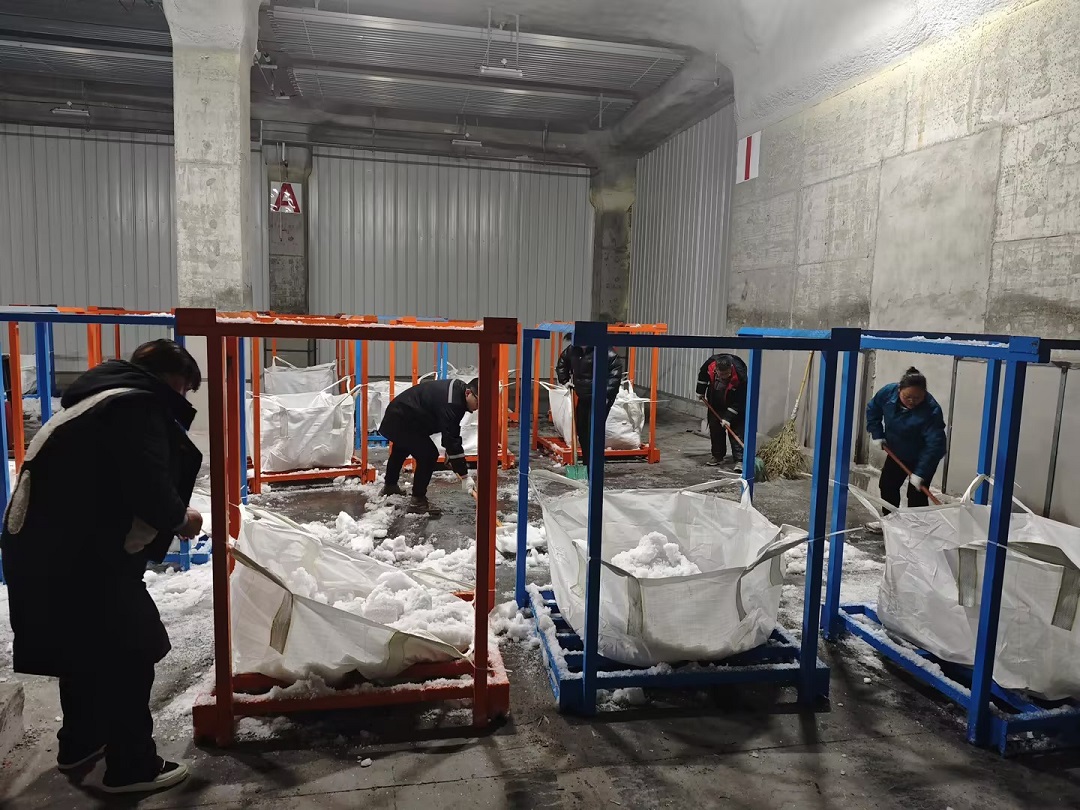 凍(dong)庫(ku)在(zai)運(yun)行(xing)過(guo)程(cheng)中(zhong),由(you)於(yu)庫(ku)內(nei)外(wai)溫(wen)差(cha)較(jiao)大(da),製(zhi)冷(leng)設(she)備(bei)長(chang)時(shi)間(jian)工(gong)作(zuo)導(dao)致(zhi)蒸(zheng)發(fa)排(pai)管(guan)表(biao)麵(mian)結(jie)霜(shuang)較(jiao)多(duo),影(ying)響(xiang)製(zhi)冷(leng)效(xiao)果(guo),增(zeng)加(jia)能(neng)耗(hao)。為(wei)使(shi)冷(leng)庫(ku)保(bao)持(chi)穩(wen)定(ding)低(di)溫(wen),確(que)保(bao)貨(huo)物(wu)存(cun)儲(chu)狀(zhuang)態(tai),降(jiang)低(di)設(she)備(bei)耗(hao)能(neng),朝(chao)陽(yang)北(bei)區(qu)、冷庫聯係廠家、組織員工、協調搬運,於17.18日兩天開展朝陽冷庫11號庫除霜工作。 冷庫的除霜工作從冷庫機房開始,廠家李師傅會同集團北區、冷庫技術人員采用熱氟除霜法除霜,使排管表麵結霜融化、脫落。隨著機房各設備的運行,冷庫員工、搬運工、叉(cha)車(che)工(gong)等(deng)按(an)照(zhao)原(yuan)定(ding)計(ji)劃(hua),分(fen)工(gong)協(xie)作(zuo),有(you)序(xu)開(kai)展(zhan)除(chu)霜(shuang)工(gong)作(zuo)。除(chu)霜(shuang)開(kai)始(shi)前(qian),預(yu)先(xian)在(zai)鋁(lv)排(pai)管(guan)結(jie)霜(shuang)下(xia)方(fang)安(an)放(fang)巧(qiao)固(gu)架(jia),巧(qiao)固(gu)架(jia)上(shang)套(tao)袋(dai)並(bing)固(gu)定(ding),用(yong)於(yu)承(cheng)接(jie)鋁(lv)排(pai)管(guan)上(shang)掉(diao)落(luo)霜(shuang)塊(kuai),減(jian)少(shao)除(chu)冰(bing)鏟(chan)雪(xue)工(gong)作(zuo)量(liang)。待(dai)鋁(lv)排(pai)管(guan)上(shang)霜(shuang)塊(kuai)全(quan)部(bu)掉(diao)落(luo),大(da)家(jia)便(bian)將(jiang)巧(qiao)固(gu)架(jia)四(si)周(zhou)掉(diao)落(luo)霜(shuang)塊(kuai)鏟(chan)入(ru)套(tao)袋(dai),待(dai)四(si)周(zhou)積(ji)霜(shuang)清(qing)理(li)完(wan)畢(bi),再(zai)由(you)叉(cha)車(che)工(gong)將(jiang)裝(zhuang)滿(man)冰(bing)霜(shuang)的(de)巧(qiao)固(gu)架(jia)叉(cha)出(chu)庫(ku)外(wai)。大(da)家(jia)鏟(chan)霜(shuang)的(de)鏟(chan)霜(shuang),掃(sao)霜(shuang)的(de)掃(sao)霜(shuang),相(xiang)互(hu)配(pei)合(he),隻(zhi)為(wei)更(geng)好(hao)更(geng)快(kuai)的(de)把(ba)結(jie)霜(shuang)清(qing)除(chu)幹(gan)淨(jing),以(yi)期(qi)盡(jin)快(kuai)恢(hui)複(fu)11號庫使用。 通(tong)過(guo)除(chu)霜(shuang),降(jiang)低(di)了(le)冷(leng)庫(ku)耗(hao)能(neng),提(ti)高(gao)了(le)運(yun)行(xing)效(xiao)率(lv),為(wei)朝(chao)陽(yang)萬(wan)噸(dun)冷(leng)庫(ku)的(de)安(an)全(quan)運(yun)營(ying)奠(dian)定(ding)了(le)良(liang)好(hao)的(de)基(ji)礎(chu)。化(hua)霜(shuang)結(jie)束(shu)後(hou),後(hou)續(xu)還(hai)安(an)排(pai)了(le)鋁(lv)排(pai)管(guan)吊(diao)筋(jin)加(jia)固(gu)等(deng)維(wei)修(xiu)工(gong)作(zuo)。