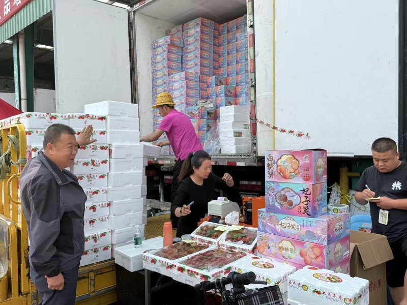 近日,朝陽水果市場端午促銷活動進行地如火如荼,水果市場中央大道兩側荔枝區也相當“鬧猛”,隨著廣東、海南等主產區荔枝大量上市,整車整櫃的荔枝持續到貨,車載銷售的荔枝並車齊驅,車擠車,人擠人,爭相競品這一口初夏甜蜜。